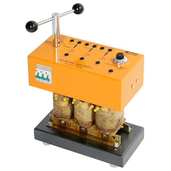 The required reactive power is set by means of a crank. For easier setting, the load reactor has a ten-turn scale with 100 scale divisions for each turn. Each winding is fitted with a fuse.