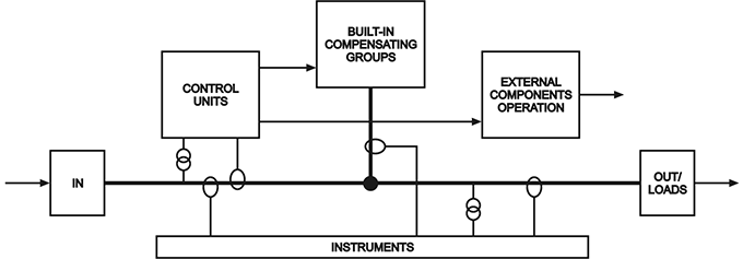 The Power Factor Control Unit is housed in a sturdy apparatus box with a clear mimic diagram explaining how to connect the supplying net from the left to the right side where the network in need for power factor compensation is connected.