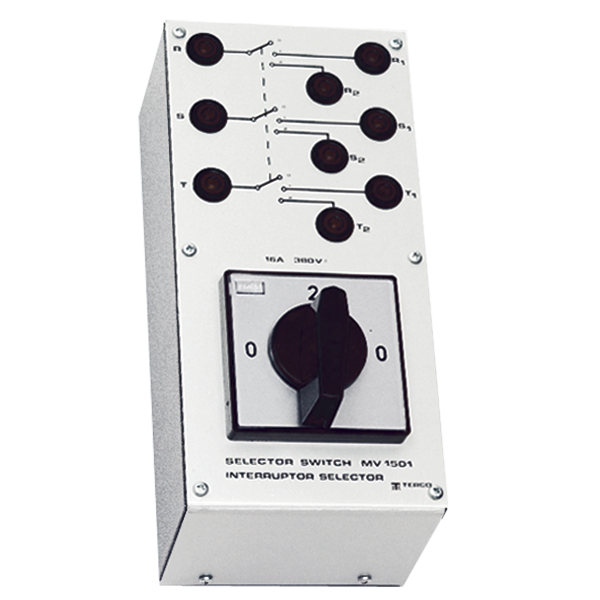 MV1501 Selector Switch – three-pole, 2-way, 16 A, 250 V-DC / 440 V-AC switch in metal case. Front panel showing symbols and technical data.