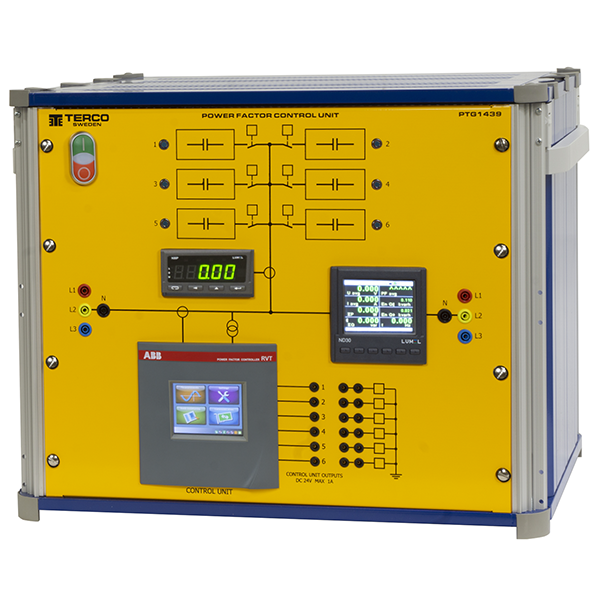 The Power Factor Control Unit is housed in a sturdy apparatus box with a clear mimic diagram explaining how to connect the supplying net from the left to the right side where the network in need for power factor compensation is connected.
