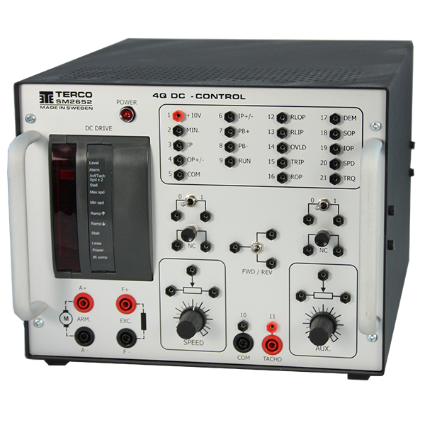 SM 2652 4-Quadrant DC Controller?is an isolated 4 Quadrant speed controller for separately magnetized or permanent motors. It utilizes speed feedback from the armature voltage (Avf), or from a shaft mounted tachogenerator. It incorporates a fully controlled anti-parallel thyristor bridge for supplying and absorbing power during the forward or breaking conditions.